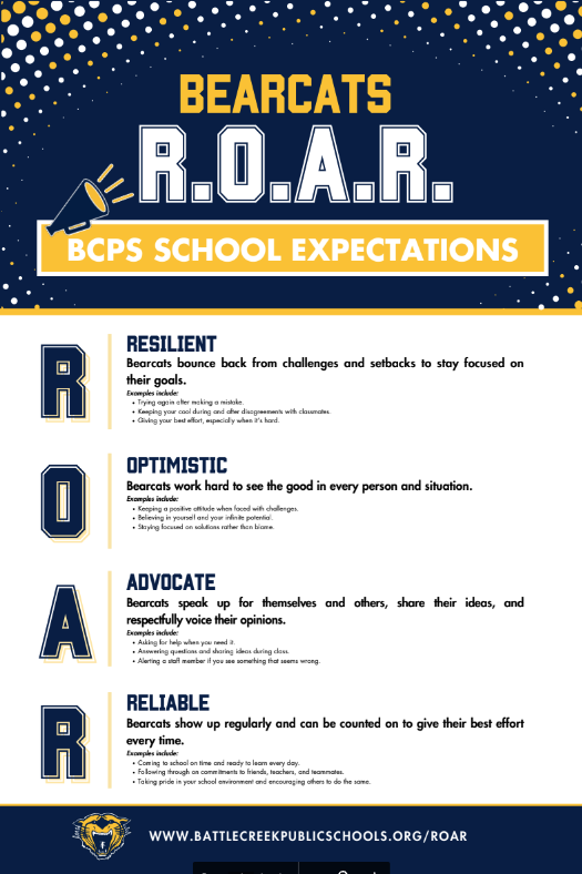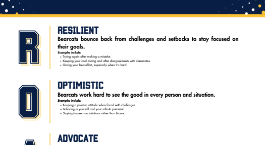 During the 2024-25 school year, we are debuting new school-wide behavior expectations across the district for our students, staff, and families to create a positive and safe learning environment so that all students can achieve their best. We want our Bearcats to be Resilient, to be Optimistic, to know how to Advocate for themselves and for others, and to be Reliable citizens.